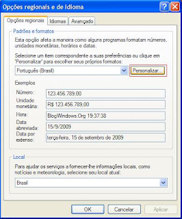 Vá ao Menu Iniciar, clique em Configurações, depois em Painel de Controle e selecione Opções Regionais e de Idioma. Agora clique na aba Opções Regionais -> Personalizar:
